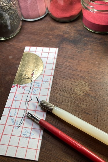 l'enluminure consiste à représenter sur un parchemin (chèvre, agneau, veau), un décor du moyen-âge représentant des scènes de vie, biblique, de batailles, ou tout autres motifs de créations imaginés par l'artiste. C'est un travail méticuleux et d'une grande précision (exemple : les très riches heures du duc de Berry) . Dans la pure tradition, les couleurs proviennent de pigments naturels trouvés dans la nature, liés à de la gomme arabique. L'éclat de l'enluminure est réhaussée à la feuille d'or (23,75 carats ) et au palladium (platine), qui remplace la feuille d'argent car elle s'oxide à l'air.