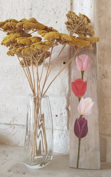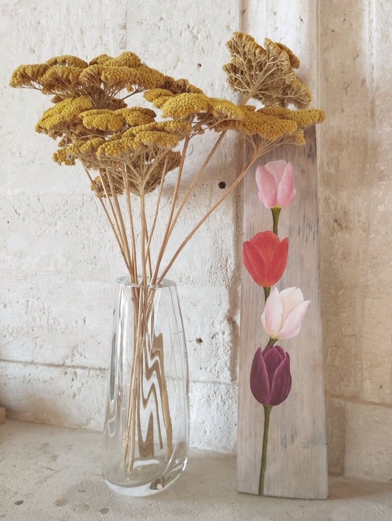 Leslie peint également sur des douelles de barrique, un beau support en chêne où prennent vie des fruits, des fleurs, des animaux, des paysages...