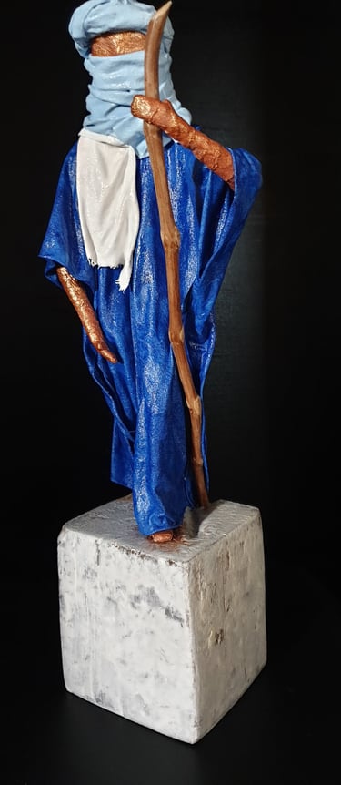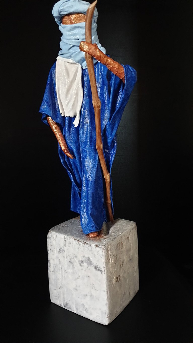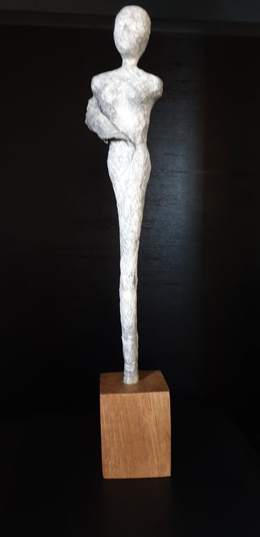 Mes sculptures prennent formes à partir de tissus récupérés, durcis et façonnés suivant la technique powertex (résine à base d'eau).
